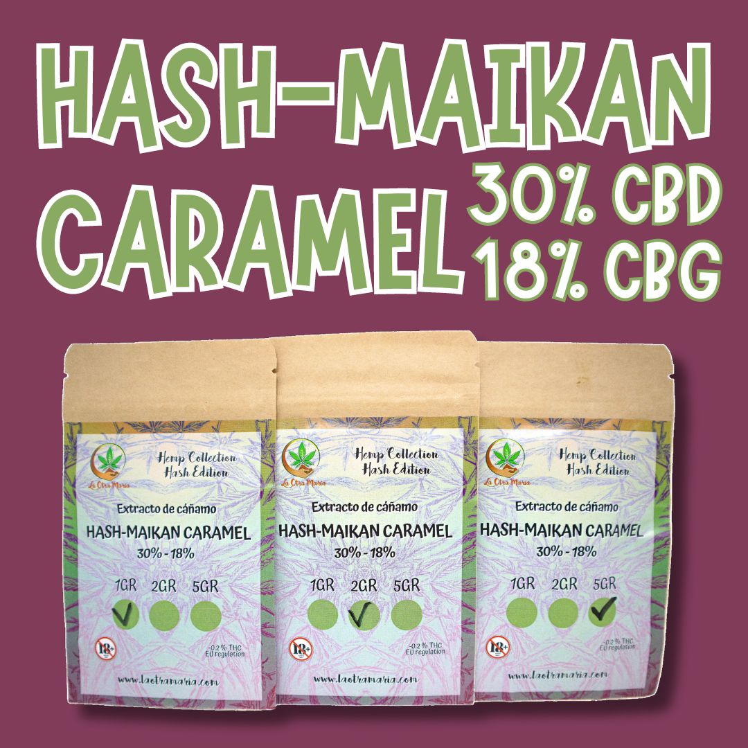 Extracto de cáñamo HASH-MAIKAN CARAMEL 30% CBD y 18% CBG – Relajación muy alta, y dolor fuerte/grave.