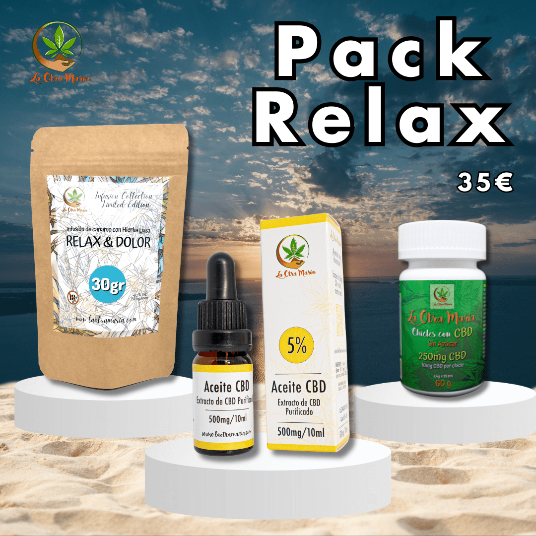 En este pack incluimos Aceite de CBD de 5%, nuestros chicles de CBD y nuestra infusión estrella, la Relax & Dolor con hierbaluisa, rooibos y cáñamo. Todos estos productos son ideales para mejorar tu día a día con productos naturales, que cuando los combinas, consigues un efecto inmejorable.